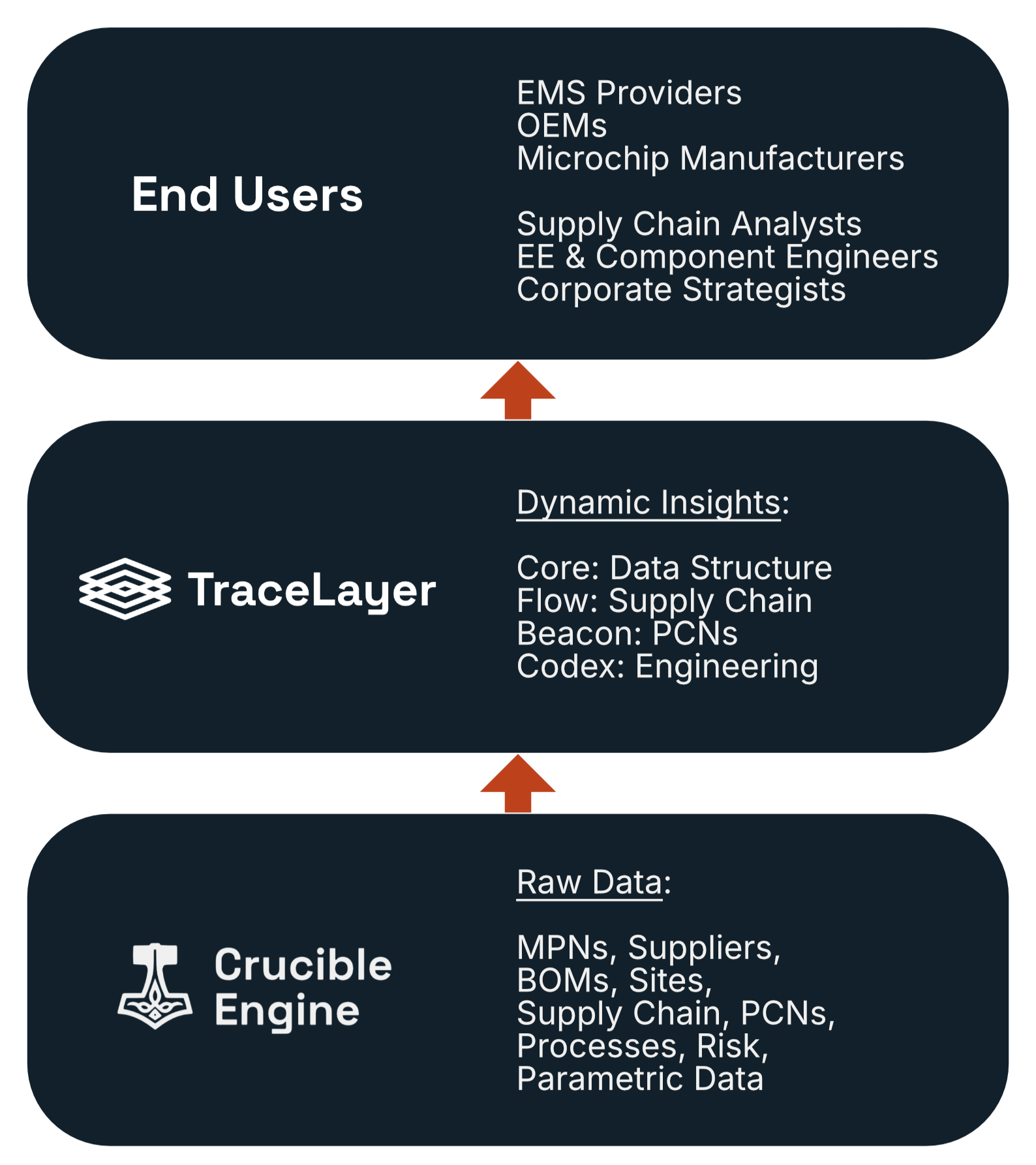 TraceLayer is the definitive supply chain app for electronic component strategy.Crucible Engine is the AI-native engine behind the scenes, turning messy data into actionable, tailored insights.The era of component selection and cross-search apps is over. In 2025, data is abundant. TraceLayer cuts through the noise to deliver comprehensive but focused information, specific to your supply chain.TraceLayer is ideal for EMS firms, OEMs, microchip manufacturers, and organizations looking to streamline their electronics supply chains.